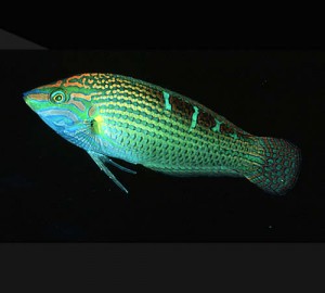 La coloración corporal de los machos es verdosa, las franjas y puntos irregulares de sus costados son azul-verde y naranjas, se tornan rosa salmón posteriormente. Sus aletas pélvicas son largas y alcanzan o sobrepasan a su ano.