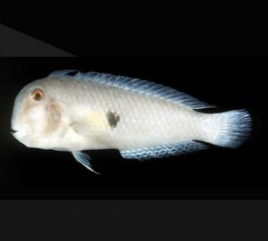Su coloración corporal es blanca-grisácea. En la parte media de los costados presenta una mancha gris oscuro y otra mancha amarillenta al frente. Delante de esta mancha amarillenta tiene otra más oscura y sus ojos son anaranjados.
