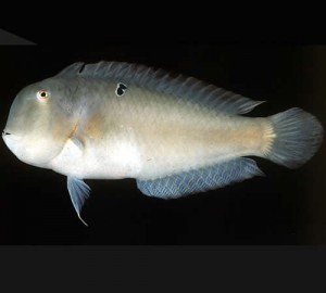 Su coloración corporal es blanca-grisácea. Su vientre y parte baja de la cabeza son blancos. Sus iris son anaranjados y tiene una mancha negra e irregular bordeada de azul en la parte media del cuerpo, debajo de la base de su aleta dorsal.