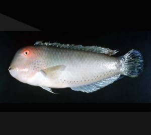 La parte baja de su cabeza es blanca, su vientre y dorso son grisáceos y sus iris son anaranjados. En las mejillas tiene varios puntos de color púrpura y en el vientre, detrás de las aletas anales hasta la base de la aleta caudal, presenta una franja compuesta por puntos de color púrpura también.
