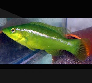 Su coloración corporal general es verde brillante, su vientre es más claro, generalmente presenta una línea blanca longitudinal que lo recorre desde el hocico hasta la aleta caudal. Los costados y el vientre de los peces más viejos generalmente son de color verde-amarillento o naranja con muchos puntos blancos pequeños que le dan un aspecto reticulado.