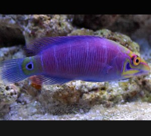 Su coloración corporal se es púrpura dorsalmente, su cabeza, frente y mejillas son amarillas y están decoradas con líneas irregulares púrpura, sus ojos son amarillos con toques de naranja, tiene un punto de color azul en la base de sus aperturas branquiales, en los costados tiene alrededor de 5 líneas verticales de color azul eléctrico, un ocelo negro bordeado de azul en el pedúnculo caudal.