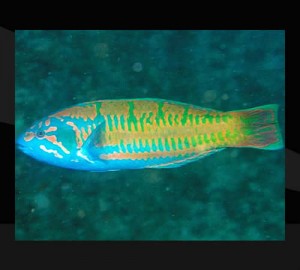 Su aleta dorsal es verde y sus demás aletas son azules.